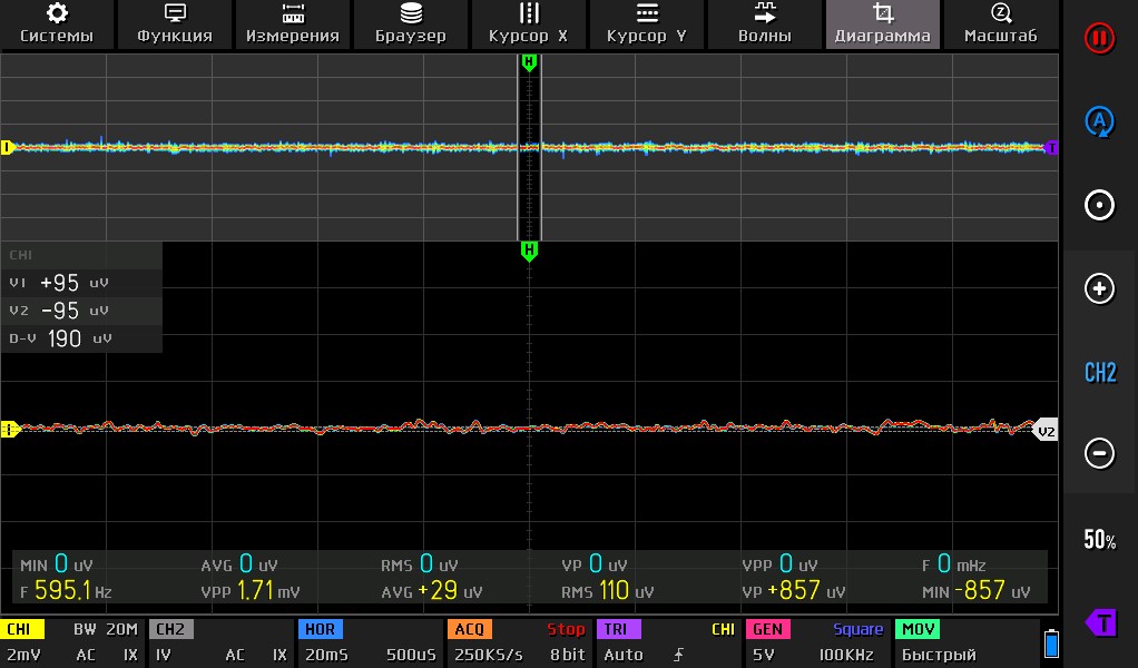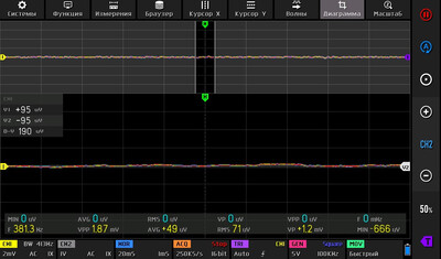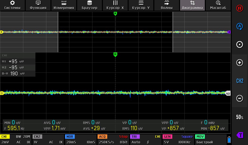 Здравствуйте, решил показать реальные шумы и фон этого повторителя который отображен на верхней схеме с замкнутым входом. Это та планка ниже которой в теории звук ещё может опускаться, но тогда это уже будет смесь сигналов которые в теории можно разделить и услышать на фоне шумов. Тут применена внутренняя фильтрация осциллографа за счёт понижения пропускной способности до 20 МГц, за счёт высокого разрешения - 16-ти бит, плюс цветовой температуры показывающей уверенное присутствие сигнала длительное время. Первая картинка и вторая картинка 8 бит разрешение с разными развёртками.