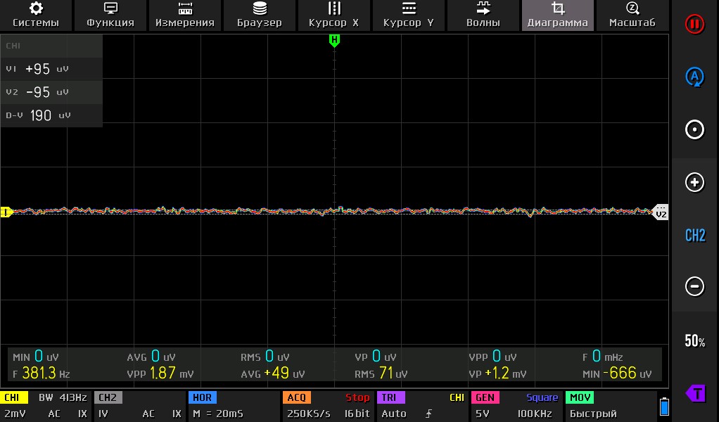 Фона тут совсем не видно, а шумы по НЧ составляют на частоте примерно 350 КГц порядка 71 микровольт. Это не далеко от того что я получал ранее другими методами. Сейчас применялся осциллограф FNIRSI DPOS350P.