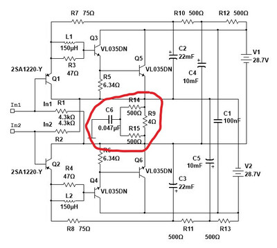 Здравствуйте, вот решил дополнить тему по устойчивости выходного каскада усилителя тока моей конструкции. Я уже раньше озвучивал, что он у меня полностью висит в воздухе - гальванически развязан с землею. Это даёт много полезных плюсов, но есть и один недостаток о котором я раньше упоминал, и похоже для многих именно этот факт является своеобразным ассоциативным барьером не позволяющим такой подход, как в моей схеме, воспринимать как-то серьёзно. Дело в том, что весь каскад всё же на все 100% электрически не полностью отделён от разнообразных каналов проникновения внешних помех которые в теории синхронно работающих плеч ни как не должны вызывать видимого и воспринимаемого ушами эффекта. Я имею ввиду наводки через емкости первичной и вторичной катушки питающего трансформатора через межвитковые ёмкости и ёмкость самих радиаторов с транзисторами и деталей с проводниками внутри корпуса. Эта цепь - входная цепь усилителя тока, шунтируется на корпус выходным сопротивлением балансного усилителя напряжения и составляет примерно 120 Ом и там же имеется ёмкостное шунтирование тем же перечисленным списком компонентов через которые могли бы проникать сетевые помехи и помехи по питающим цепям. То есть как минимум входом усилитель тока всё же привязан к общему проводу, шасси и корпусу. Опять же напомню - усилитель тока, напряжение не усиливает, и слышать помехи эта цепь просто не позволяет, тем более синхронно их усиливая, только гасит их. Второй канал проникновения который так же синхронный, это кабеля до акустических систем и сама акустика. Опять же это практически антенны длиною в несколько метров которые так же шунтируются но уже ёмкостями схемы и входными резисторами опять на этот же выход усилителя напряжения общим сопротивлением 2 кОм. Уже этот номинал резистора, при достаточно сильных помехах в эфире, по сути от бытовой аппаратуры, позволяет появляться небольшим радионаводкам между входом и выходом усилителя тока с значимыми и теоретически слышимыми амплитудами. Речь о сигналах способных доходить до милливольт. И какой бы идеальный и подогнанных по симметрии плеч усилитель тока не был, но слабые шумы радиопомех он будет детектировать в еле различимые шорохи или техногенный шум если приблизится к АС вплотную. Я из этого секрета не делал, и ранее упоминал. Проблемой на самом деле это не является, но стремление к идеалу мне покоя всё же не давало. Вот собственно способ решения этой проблемы в железе.