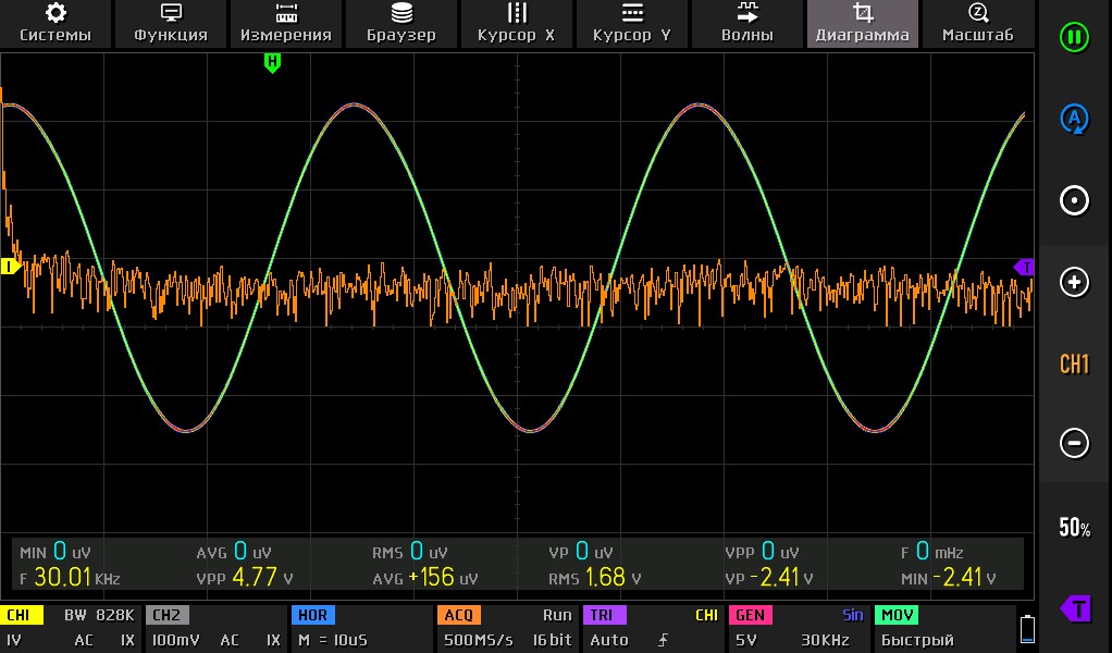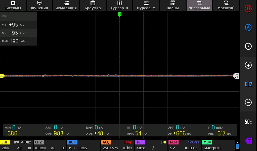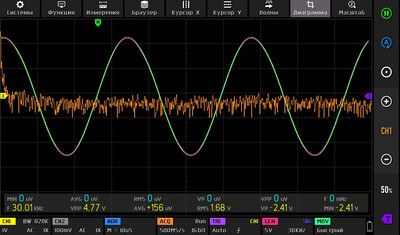 Это функция измерения гармоник, я не совсем понимаю как к ней можно прилепить курсоры. По сути это спектроанализатор того же сигнала который на осциллограмме поверх экрана. Он показывает чистоту синуса, есть пики высших гармоник или нет. FFT показатель. Добавлено (28.03.2026, 15:40) --------------------------------------------- Быстрое преобразование Фурье.