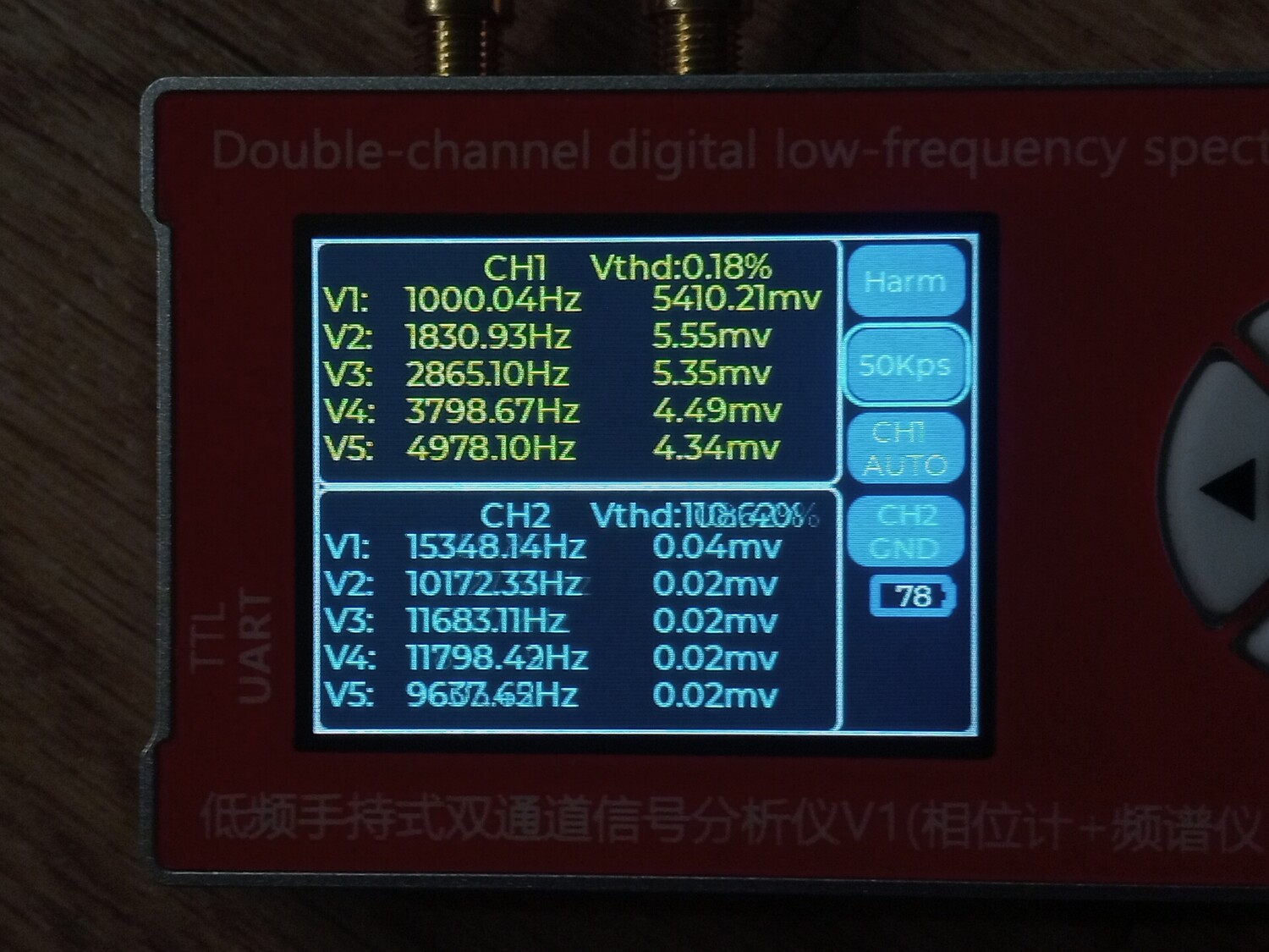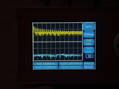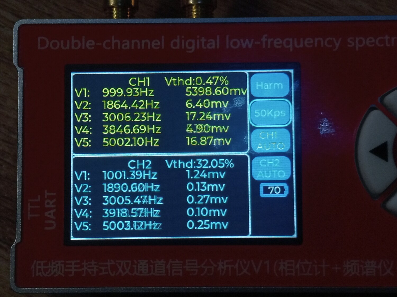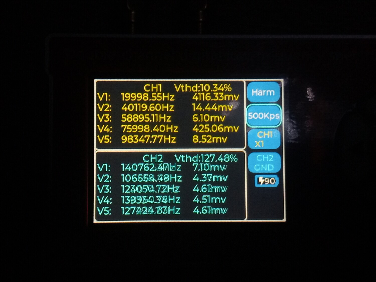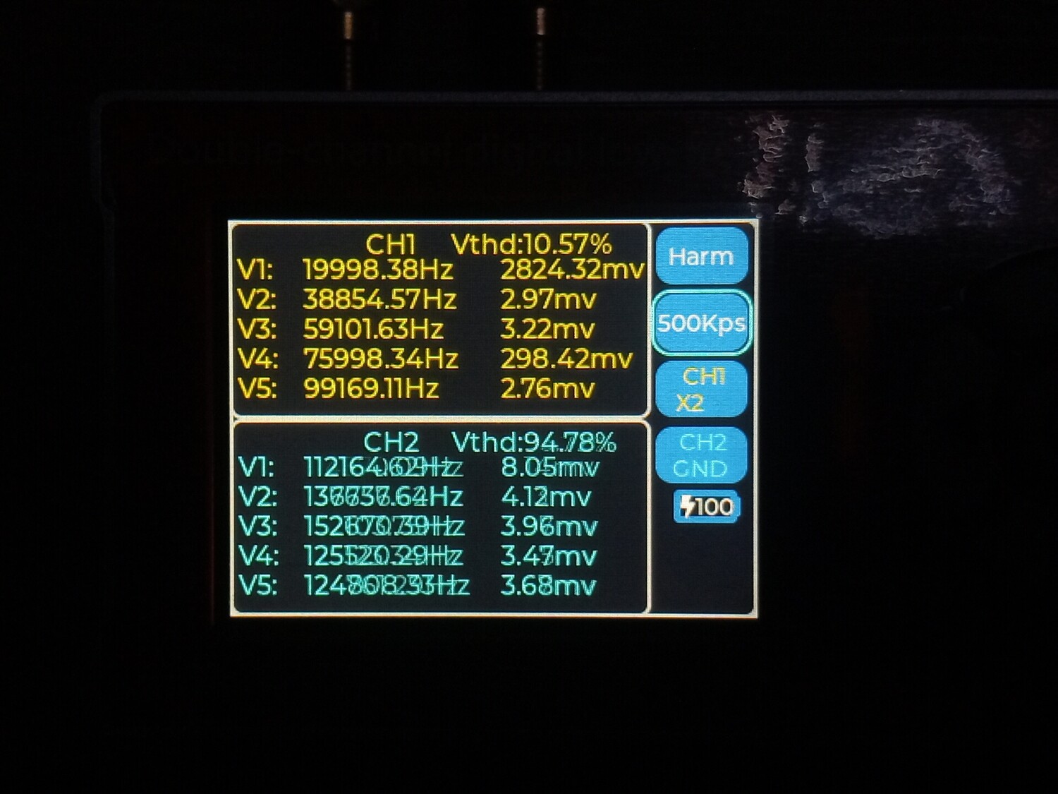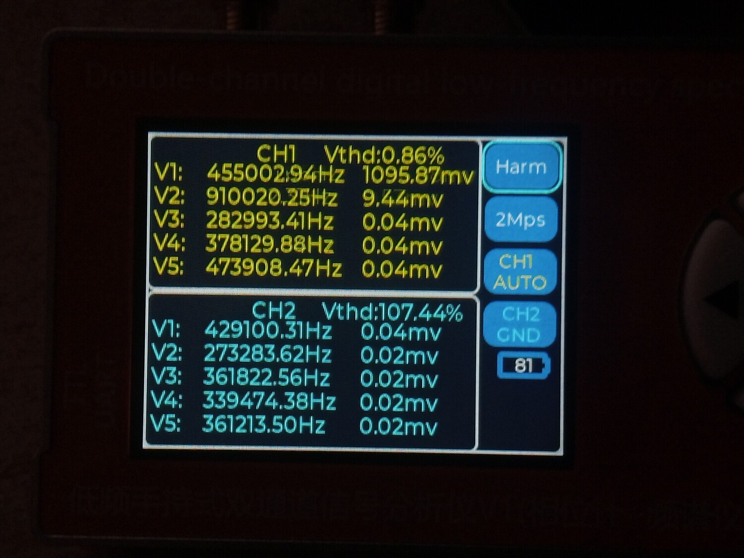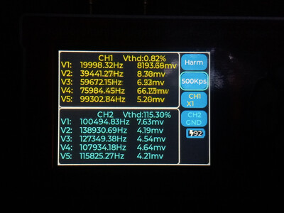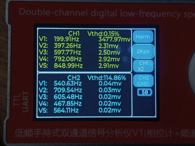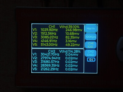 Цитата VK (  ) Чё то моя логика с этими цифрами абсолютно не срабатывает. Что желтое и что голубое, не говоря о V1 ... V5 что это? Желтое это первый канал, голубое второй. Второй не использовался, измерения проводились по первому, желтому. Vи номер рядом это порядковый номер гармоники которую обнаружил прибор и её частота с амплитудой от пика до пика. То есть если V1 = 1000.2 к примеру, то это и есть основная тестируемая частота полученная о ЦАПа, а всё, что имеет номера 2,3,4,5 это порядковые номера гармоник более высокого порядка.Добавлено (09.01.2026, 21:28) --------------------------------------------- В некоторых случаях, когда я подключал прибор к штатному выходу с операционным усилителем, то я включал и второй - синий канал. Тогда на нём появлялись вменяемы числа и фаза с частотою и гармоники соответствующие. Добавлено (09.01.2026, 21:42) --------------------------------------------- В целом приборчик, как видно на фото, совсем небольшой, размером меньше ладони, как пачка сигарет примерно. В нём аккумулятор, он может включаться и выключаться. Но в обоих случаях прибор может работать и от кабеля, от повербанка, адаптера или компьютера, и заряжаться одновременно. Особых проблем при внешнем питании - помех к примеру, я не обнаружил. Штука полезная хотя бы для того, что бы исчезли некоторые иллюзии. Можно кстати и D класс посмотреть к примеру, как через него проходит калибровочный сигнал осциллографа, и какие будут проценты искажений на разных частотах.