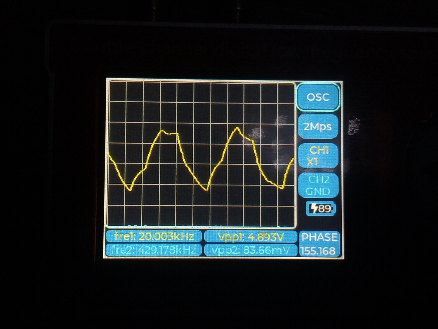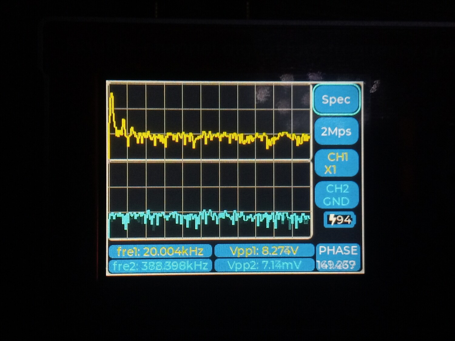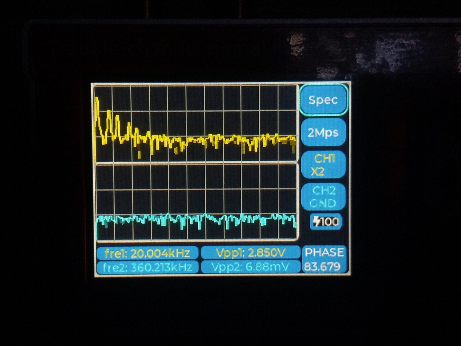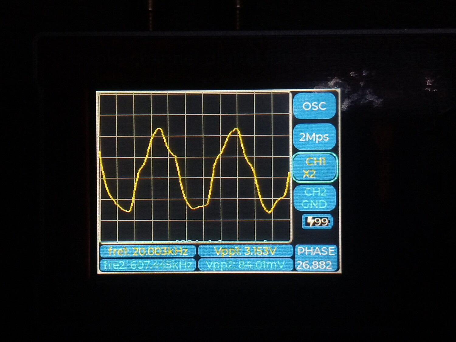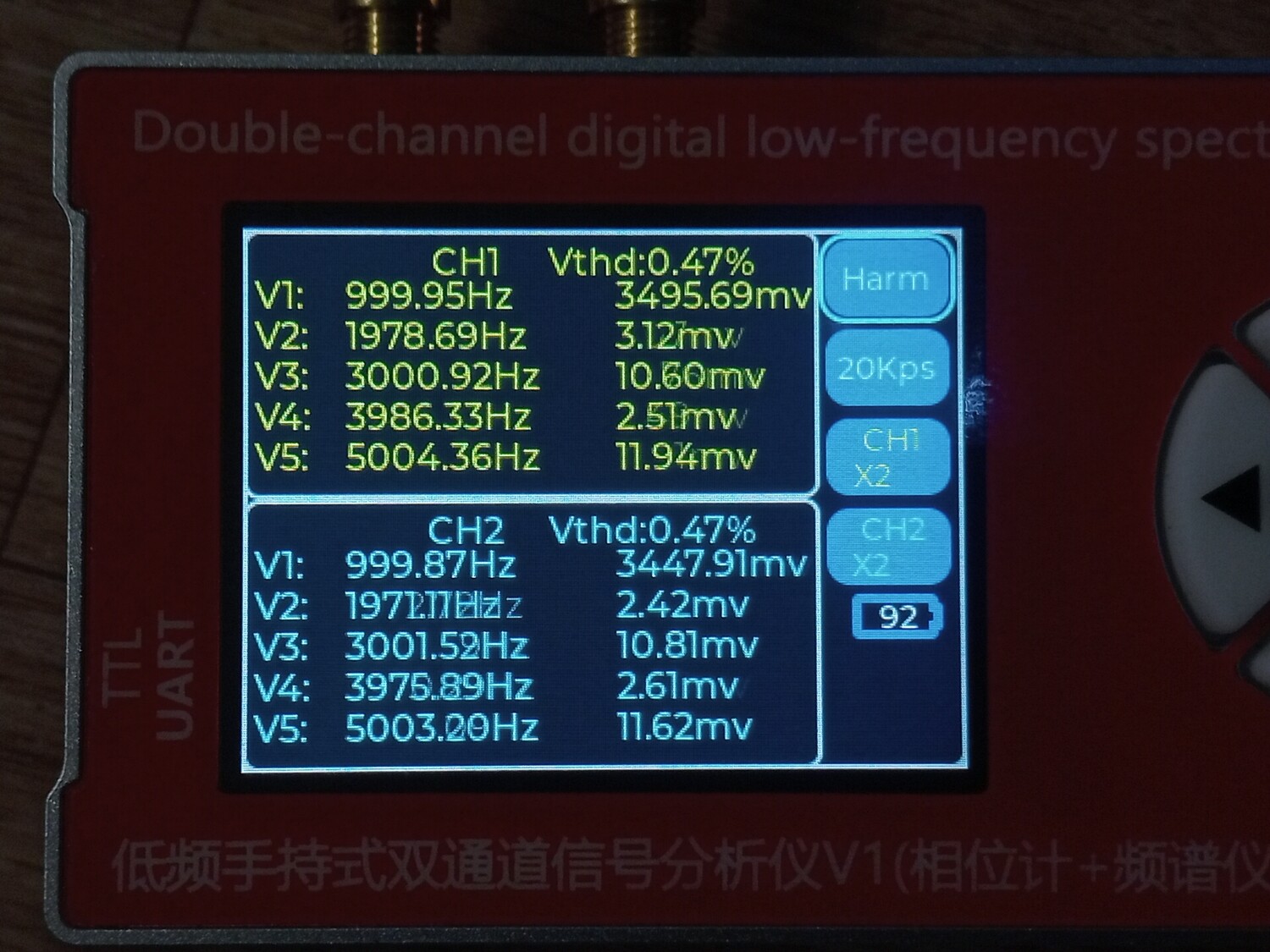 Цитата VK (  ) Чё то моя логика с этими цифрами абсолютно не срабатывает. Что желтое и что голубое, не говоря о V1 ... V5 что это? Желтое это первый канал, голубое второй. Второй не использовался, измерения проводились по первому, желтому. Vи номер рядом это порядковый номер гармоники которую обнаружил прибор и её частота с амплитудой от пика до пика. То есть если V1 = 1000.2 к примеру, то это и есть основная тестируемая частота полученная о ЦАПа, а всё, что имеет номера 2,3,4,5 это порядковые номера гармоник более высокого порядка.Добавлено (09.01.2026, 21:28) --------------------------------------------- В некоторых случаях, когда я подключал прибор к штатному выходу с операционным усилителем, то я включал и второй - синий канал. Тогда на нём появлялись вменяемы числа и фаза с частотою и гармоники соответствующие. Добавлено (09.01.2026, 21:42) --------------------------------------------- В целом приборчик, как видно на фото, совсем небольшой, размером меньше ладони, как пачка сигарет примерно. В нём аккумулятор, он может включаться и выключаться. Но в обоих случаях прибор может работать и от кабеля, от повербанка, адаптера или компьютера, и заряжаться одновременно. Особых проблем при внешнем питании - помех к примеру, я не обнаружил. Штука полезная хотя бы для того, что бы исчезли некоторые иллюзии. Можно кстати и D класс посмотреть к примеру, как через него проходит калибровочный сигнал осциллографа, и какие будут проценты искажений на разных частотах.