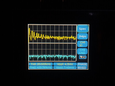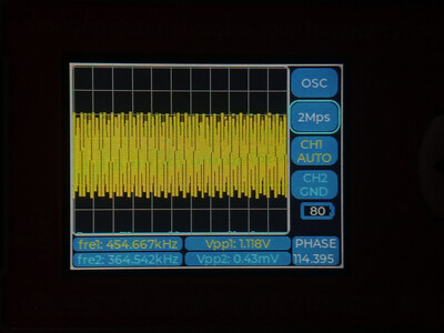 Это несущая частота. Почти 455 кГц. Этот осциллограф её наверное показывает не корректно. Сейчас попробую рассмотреть обычным осциллографом.